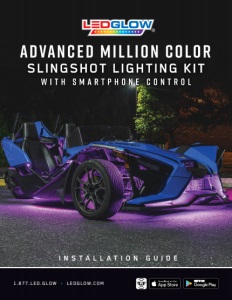 Tech Support 856-768-5700 Ext. 2 • TechSupport@LEDGlow.com ® LEDGlow Lighting, LLC • LEDGlow.com 1 I N S T A L L A T I O N G U I D E Advanced Million Color Control Box with Smartphone Control WARNING: DO NOT USE THIS SOFTWARE WHILE OPERATING A MOTOR VEHICLE. THIS PRODUCT IS DESIGNED FOR OFF ROAD USE ONLY. PLEASE CHECK YOUR LOCAL AND STATE LAWS FOR THE PROPER USE OF THIS PRODUCT. Every state has different policies and procedures in place regarding aftermarket LED lighting accessories. LEDGlow is not responsible for any fines that you may receive while using this lighting kit. This kit is for off-road use only. Warning: The installation of this kit is recommended to be installed by a licensed professional. The improper installation of this kit will void all warranties. It is recommended to install each lighting strip using Adhesion Promoter, which allows for a much stronger bond between the adhesive tape of the light strip and the cleaned mounting surface of your Slingshot. Adhesion Promoter is an optional installation accessory that is NOT included with your Slingshot lighting kit. PLEASE READ THE FOLLOWING INSTRUCTIONS THOROUGHLY BEFORE INSTALLING AND OPERATING THIS LED SLINGSHOT KIT. 1. Upon receiving your new Slingshot lighting kit, we ask that you first test the kit to ensure it is functioning correctly. Plug the male connections from the strips and control box into the female connections of the harness. Connect the red power wire to the positive terminal of the battery and the black ground wire to the negative terminal of the battery. Once the wires are temporarily secure, power the kit to ensure full functionality before installing it. If everything appears to be working correctly, turn the kit off and disconnect the power and ground wires from the battery to prepare for installation. 2. Starting with the (2) 36” side mounted LED underbody tubes, clean the left and right side frame tubing with alcohol prep pads. 3. Apply adhesion promoter to the cleaned area. 4. Ensure the wire side of the tube is towards the front of the vehicle, and the LEDs are facing outwards. Attach the underbody tube by pressing it firmly onto the mounting location. Secure with zip-ties. SLINGSHOT LIGHTING KIT INCLUDES: • Bluetooth Control Box • (2) Wireless Remotes • Double-Sided Tape Pad • Zip Ties • LED Lighting Strips • (2) Power Harnesses TABLE OF CONTENTS Slingshot Kit Installation 1 Apple iOS Pairing Instructions 4 Android Pairing Instructions 5 Device Pairing Tips & Troubleshooting 6 LEDGlow Motorcycle Control App Functions 7 Settings 8 Wireless Remote Function 9 Terms and Conditions 10